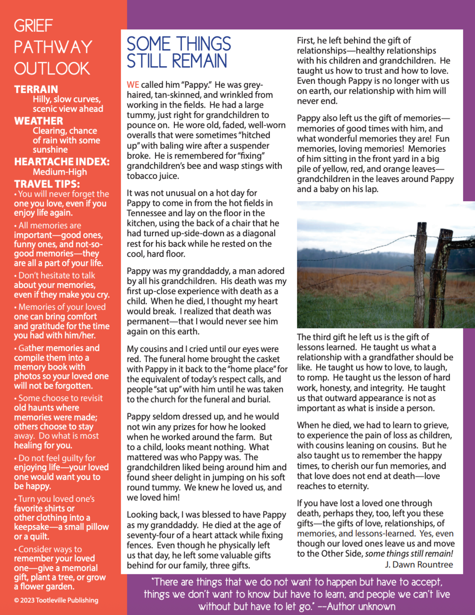 “Pathways through Grief,” a series of 7 mailers, can help bring comfort to those who are grieving during the first year after a loss. “Pathways” are appropriate for use by individuals, hospices, churches or funeral homes. Each “Pathway” provides a story to urge anyone who is grieving toward hope and healing.